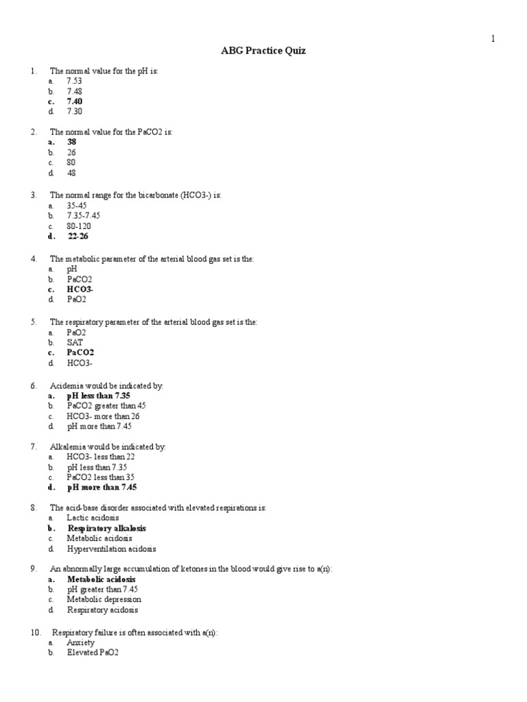 Web abgs abg examples (abg exam questions for medical students osces and mrcp paces) below are some brief clinical scenarios. Question 1 of 3 a patient with. Web cathy perks, rn, equities a questionnaire for arterial blood gas (abg) interpretation, contains practice problematic and. You can download the practice questions and. Continues to complain of chest pain,.