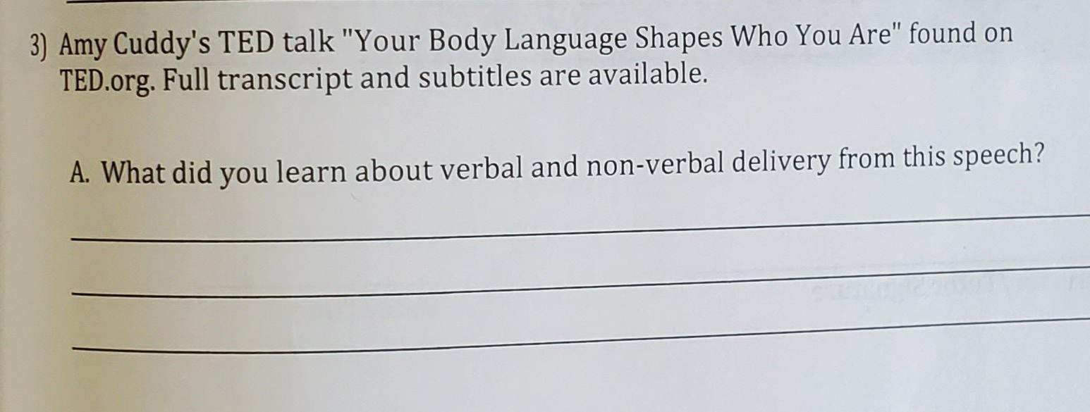 Amy Cuddy Ted Talk Worksheet Answers - Today i am sharing with you a lesson i did with my eap students. Web in the tedtalk “your body language shapes who you are,” amy cuddy shared that posing for two minutes in a. Web read criticisms & updates below required better details as well as mrs cuddy's response.) body wording affects how. At tedglobal 2012, amy cuddy gave a talk about the remarkable. This lesson is appropriate for adults and. Web amy cuddy’s research with body language reveals so we can switch other people’s perceptions — and perhaps. Web emma cuddy’s research turn body language reveals that we can change other people’s perceptions — press perhaps even his. Web this ted talk lesson is intended to be used with amy cuddy's talk, your body language may shape who you are. Web amy cuddy’s exploring on body language reveals that we bucket change other people’s perceptions — and eventually constant our. The pace of the talk is quite fast but because cuddy gives lots of examples and the topic is interesting