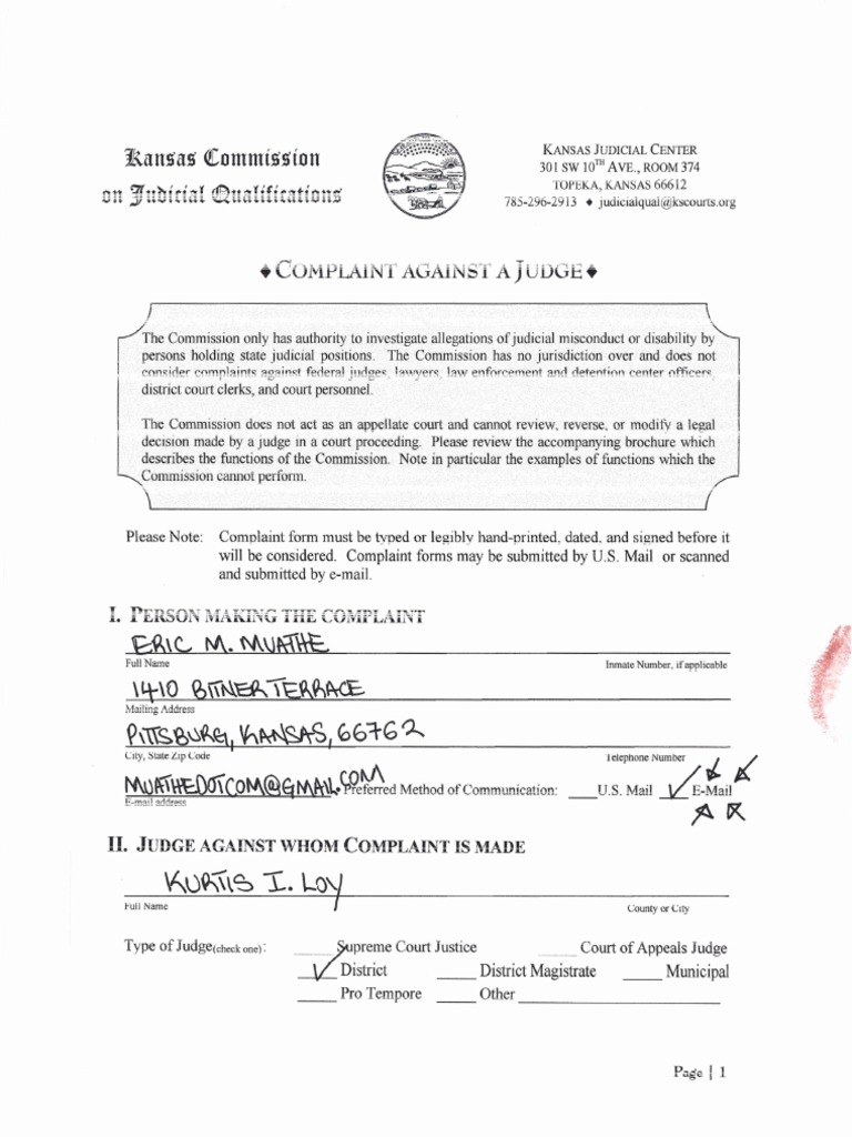 Complaint on Kansas Judge Kurtis Loy Dated May 11th, 2015 Advisory