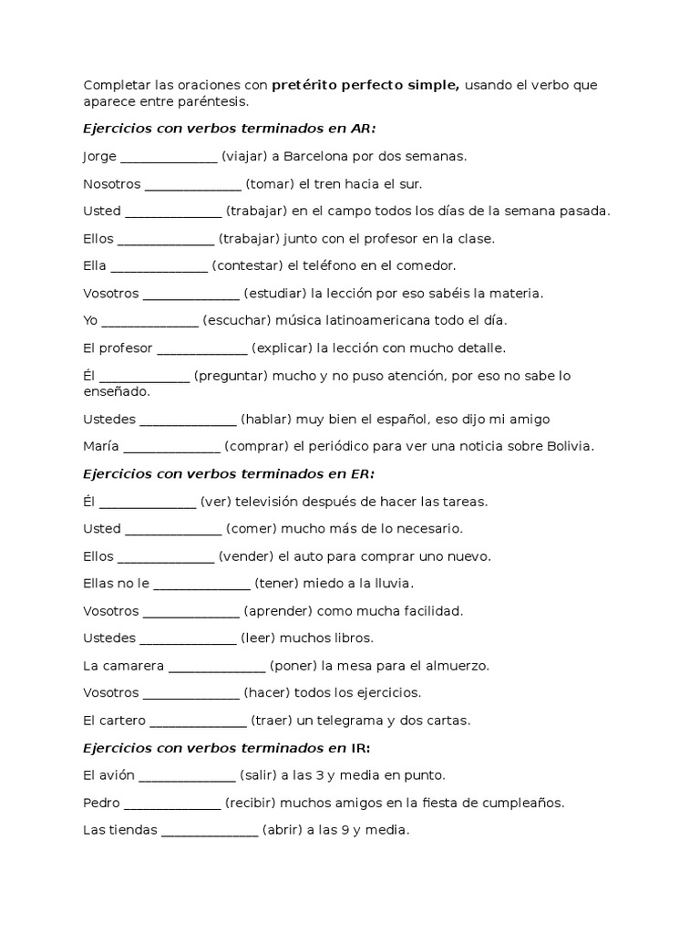 Completar Las Oraciones Con Pretérito Perfecto Simple