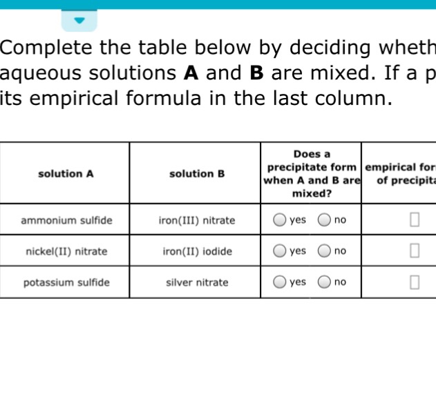 Web complete the table below by deciding whether a precipitate forms when aqueous solutions a and b are mixed. Web complete the table below by deciding whether a precipitate forms when aqueous solutions a and b are mixed. A precipitate is a solid formed in a double displacement reaction. Web if a precipitate will form, enter its empirical formula in.