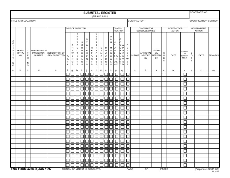 Web eng form 4288 r the submittal register. Use get form or simply click on the template preview to open it in the editor. Easily fill out pdf blank, edit, and sign them. Click the get form or get. This government document is issued by army corps of engineers for use in u.s.