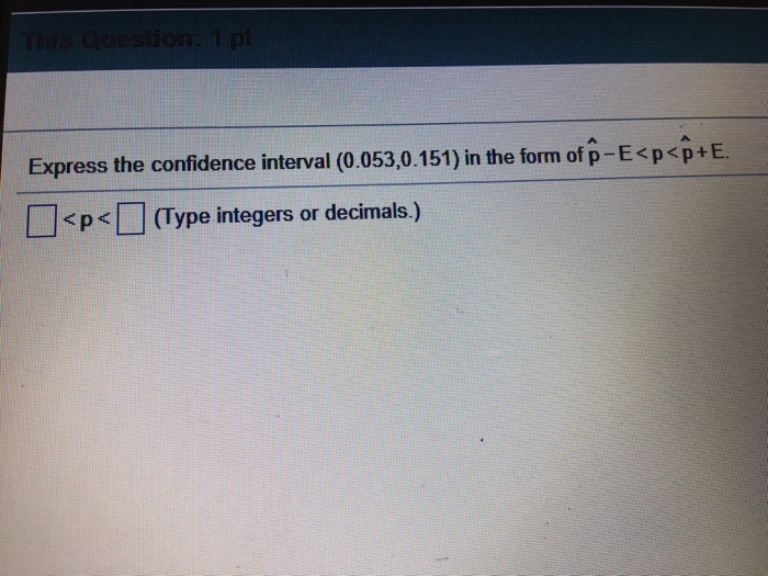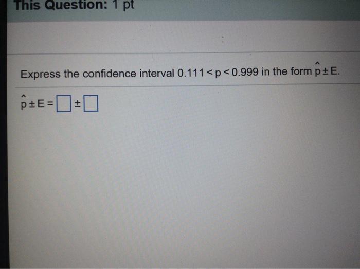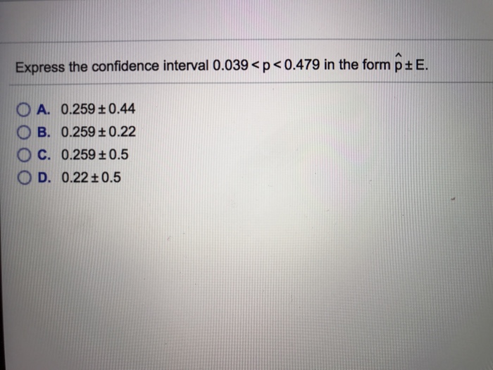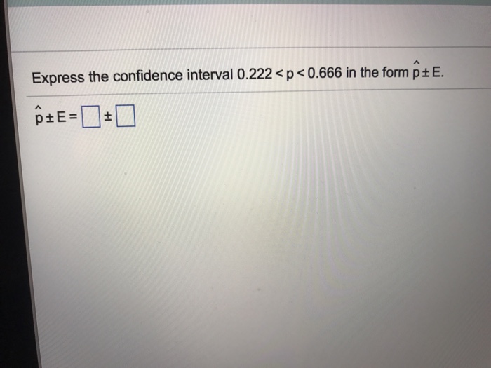Express The Confidence Interval P In The Form . - Web this means that, for example, a 95% confidence interval will be wider than a 90% confidence interval for the same set. Web about this tutor ›. Web confidence interval=mean of sample ± critical factor × standard deviation of the sample. Web to calculate the confidence interval, one needs to set the confidence level as 90%, 95%, or 99%, etc. A confidence interval visualizes the. Construct a 90% confidence interval. Web express the confidence interval 0.111 < p< How many of the 3481 subjects used at least one prescription medication? Web a 99% confidence interval is an interval with a confidence level of 99%. Web steps to calculate the confidence interval (ci) from the p value (p) and the estimate (est) for a difference.