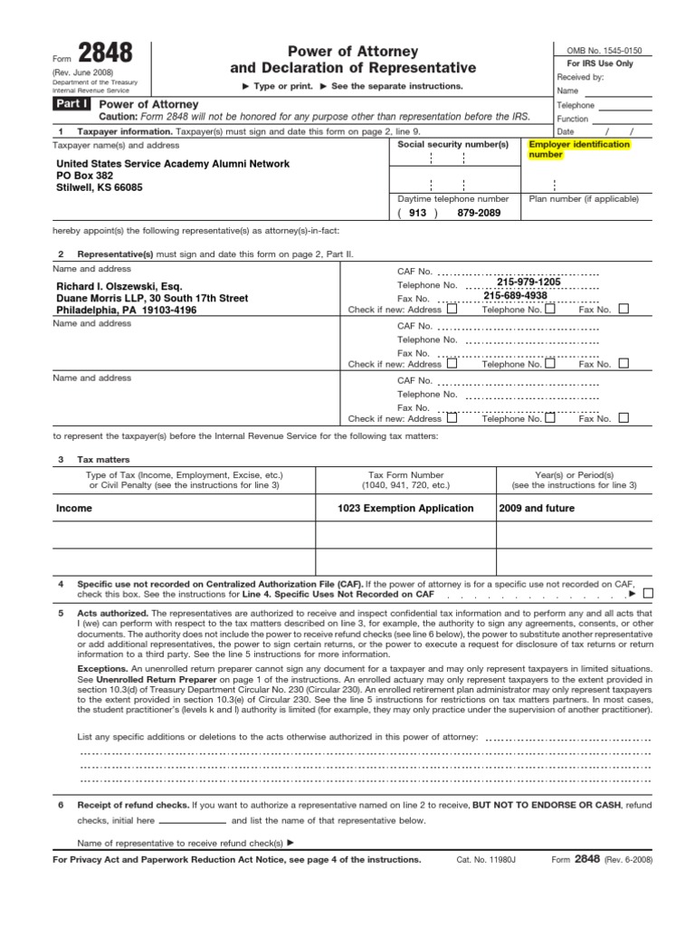 USSAAN Form 2848 Power of Attorney Internal Revenue Service