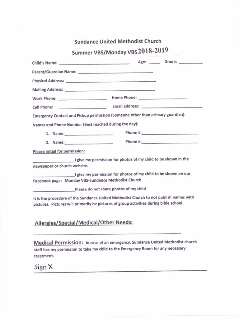 2018 Vacation Bible School Registration form Zion's Lutheran