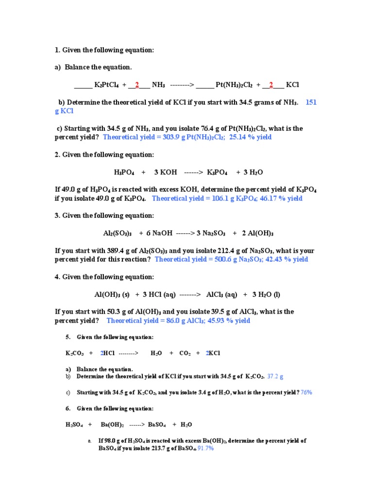 Limiting Reagent Worksheet 1 Answers Percent Yield Worksheet