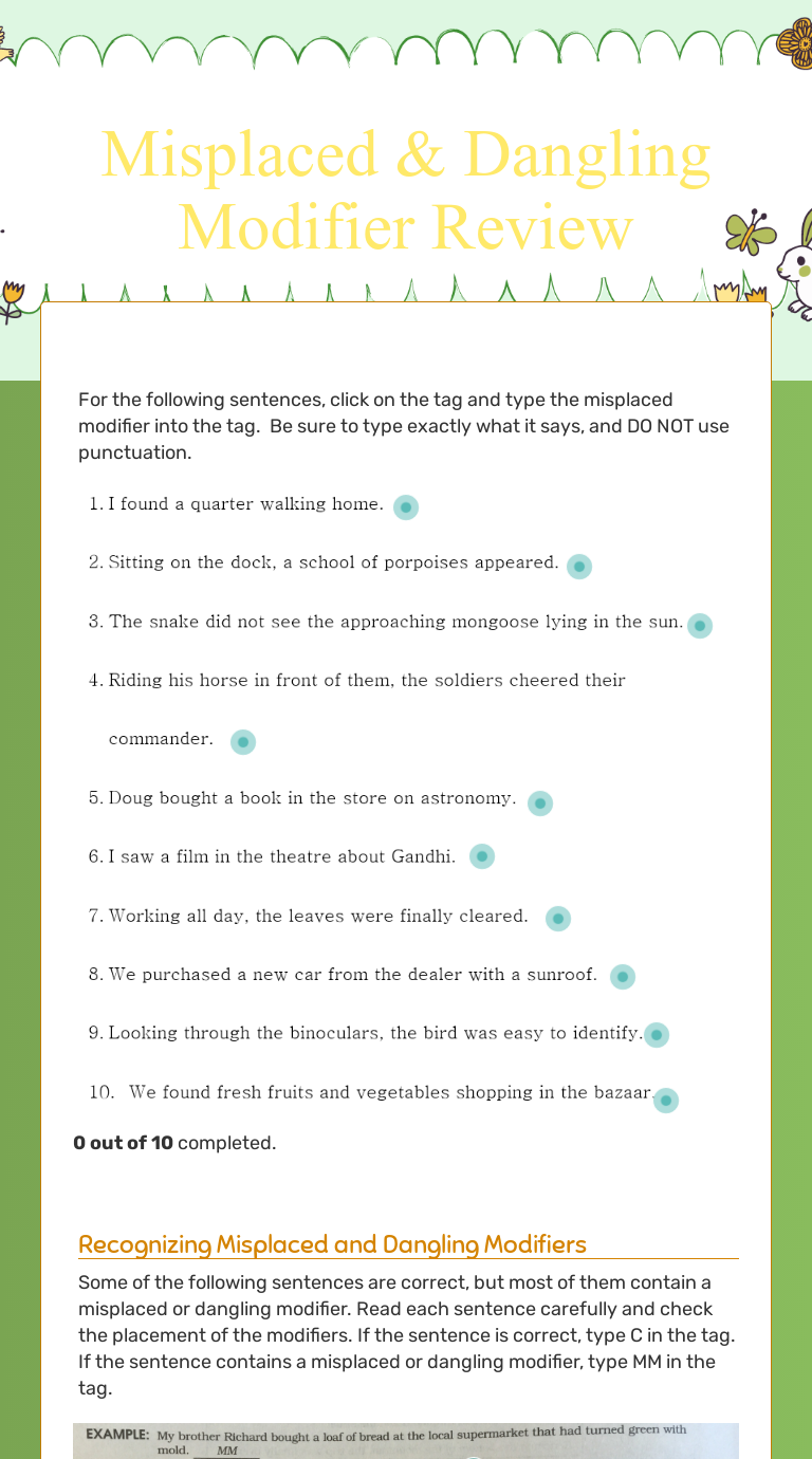Misplaced & Dangling Modifier Review Interactive Worksheet by Megan