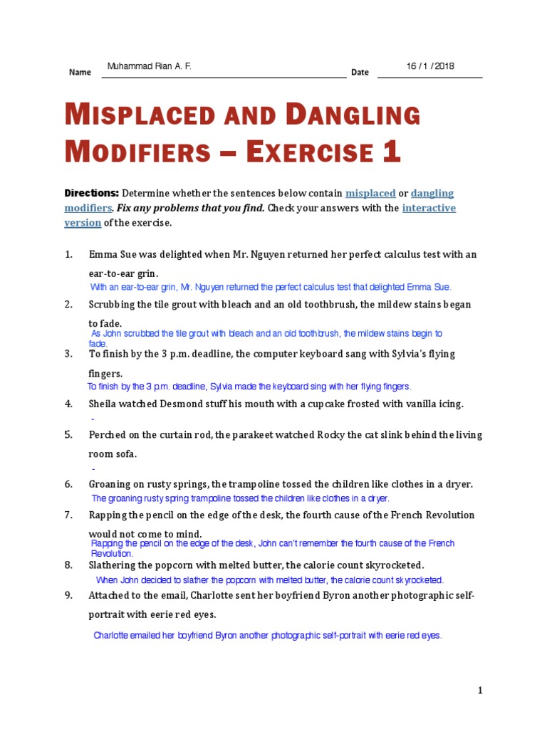 Web misplaced and dangling modifiers worksheet for grade 6, you learn how to fix these errors in the sentences to perfect your grammar. Identify misplaced and dangling modifiers #1. Web a dangling modifier modifies a noun or verb that never actually appears in the sentence. ☆ individual practice for misplaced. Web sentences that contain misplaced or dangling modifiers can be.