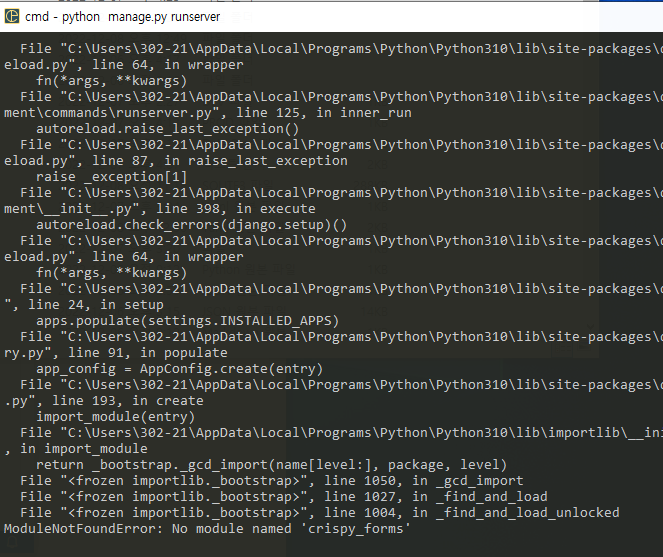 장고 프로젝트 오류 ModuleNotFoundError No module named 'crispy_forms'