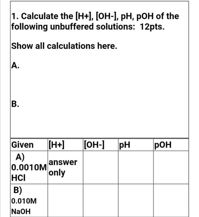 Solved 1. Calculate the (H+), [OH], pH, POH of the
