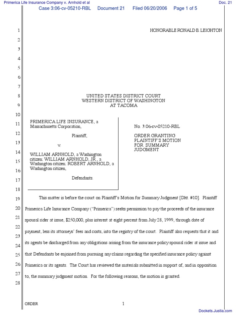 Primerica Life Insurance Company v. Arnhold et al Document No. 21