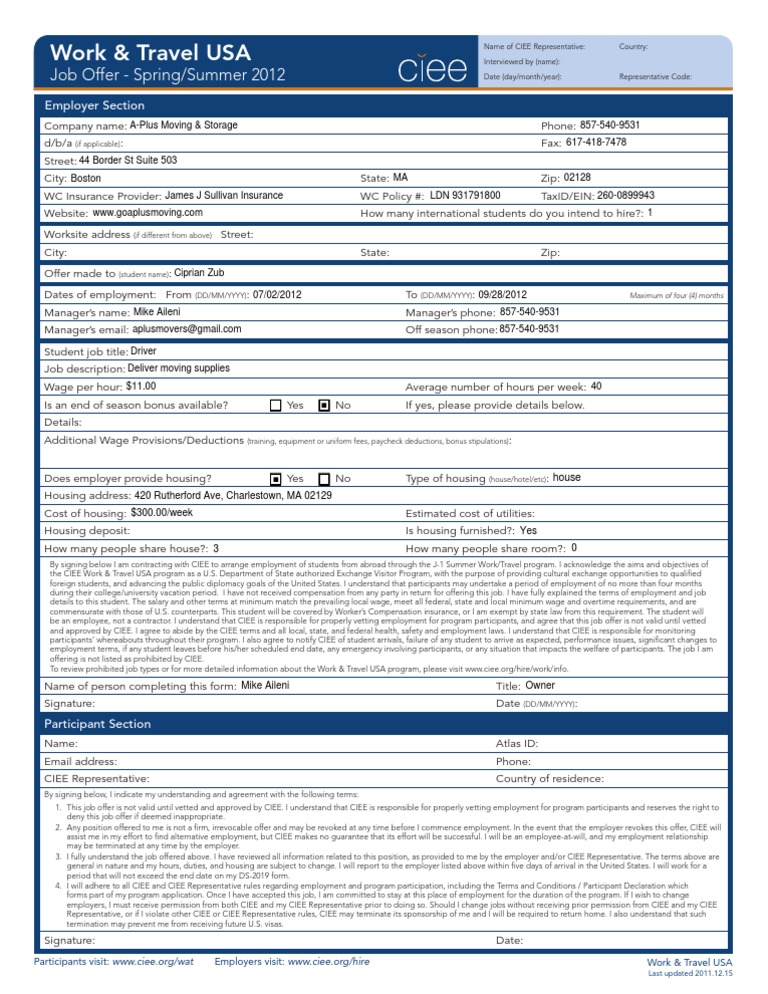 Job Offer Form 2012 Cieezub CiprianAplus Employment Labor