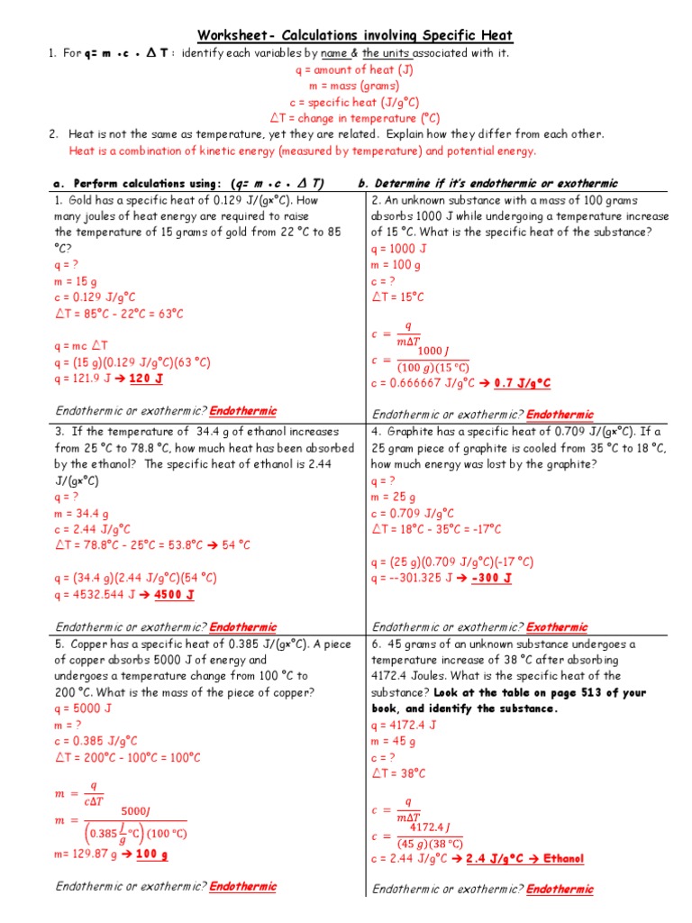 Web 2 worksheets consisting of 25 questions and answers for the introduction to heat. Show all work and units. 50 assorted questions answers included. A reaction causes the temperature of the calorimeter to change from 22.34oc to 25.12oc. This worksheet is for specific heat capacity, shc, calculations at gcse.