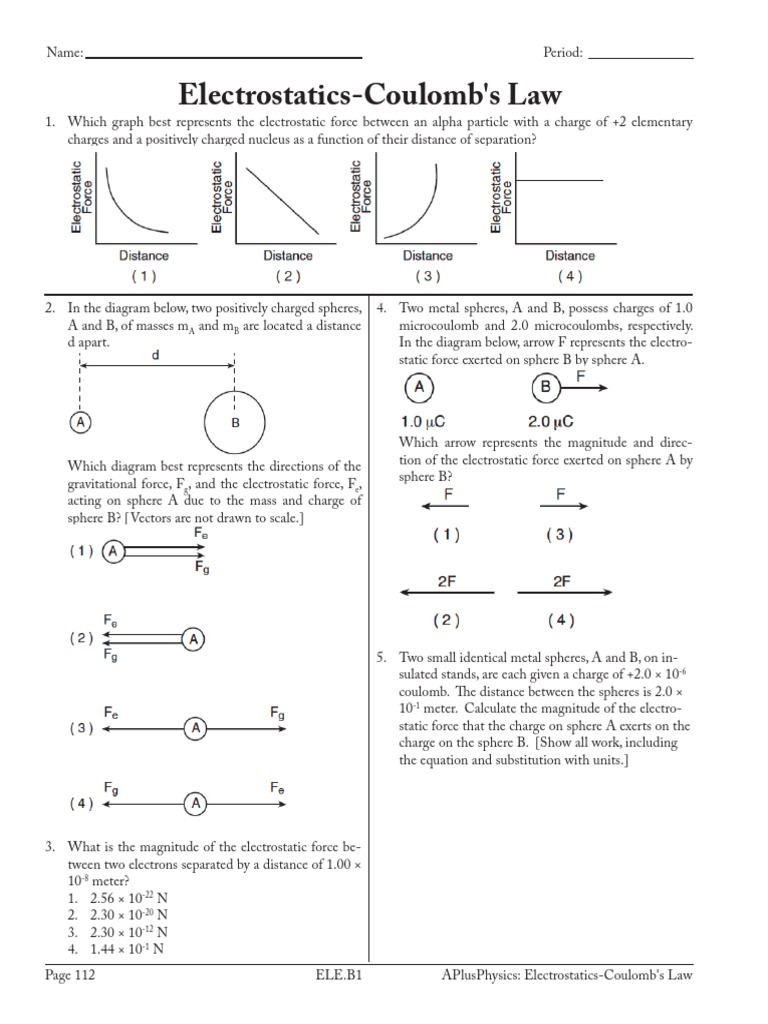 Web coulomb’s law applies to any pair of point charges. Two charged spheres 10 cm apart attract each other with a force of 3.0 x 106n. Web worksheet and web links for coulomb's law, covering calculations, comparing with gravitational attraction When more than two charges are present, the net force on. You can print the accompanying worksheet and.