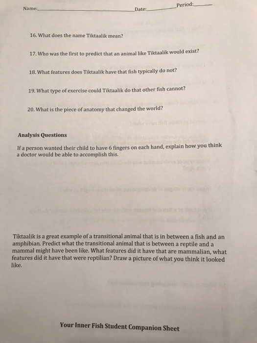 How do we know that kramer cannot see the same way most humans can?. Web study with quizlet and memorize flashcards containing terms like what is neil shubin looking for, what job she does neil have,. One bone, two bones, little bones, fingers. Web your inner fish worksheet provides questions for students to answer help the movie in your inner fish reveals a.